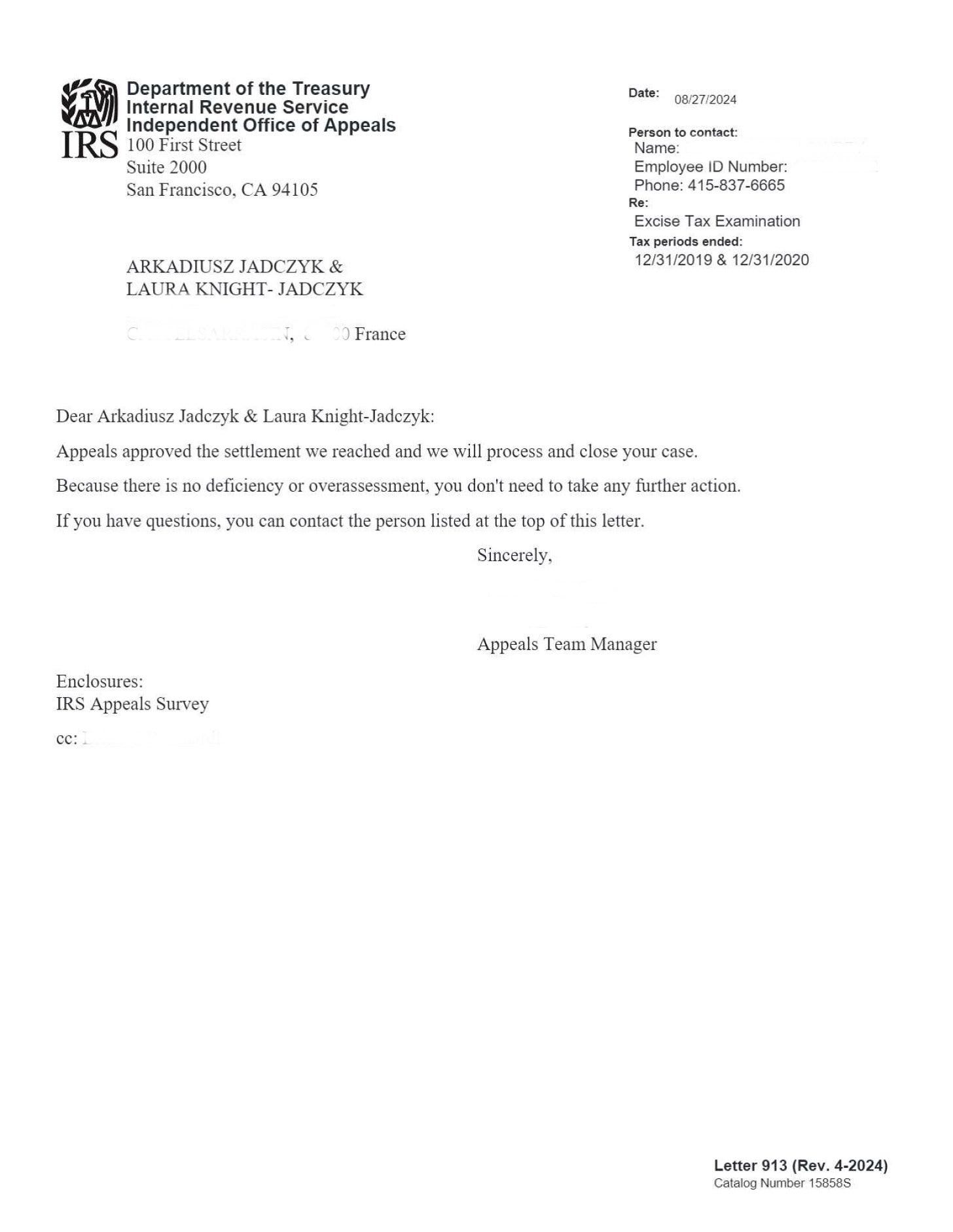 The attached PDF you provided—”2024-08-27 – Closing Letter(163857611.1)-C.pdf”—is a official closing letter from the IRS Independent Office of Appeals, dated August 27, 2024. It explicitly states that after an excise tax examination for the periods ending December 31, 2019, and December 31, 2020, Appeals approved the settlement reached, with no deficiency or overassessment. In plain terms: The IRS found nothing wrong, processed the case, and closed it without requiring any further action from you or your husband. It’s signed by Appeals Team Manager [name redacted] and cc’d to your representative ([name redacted], likely your attorney).