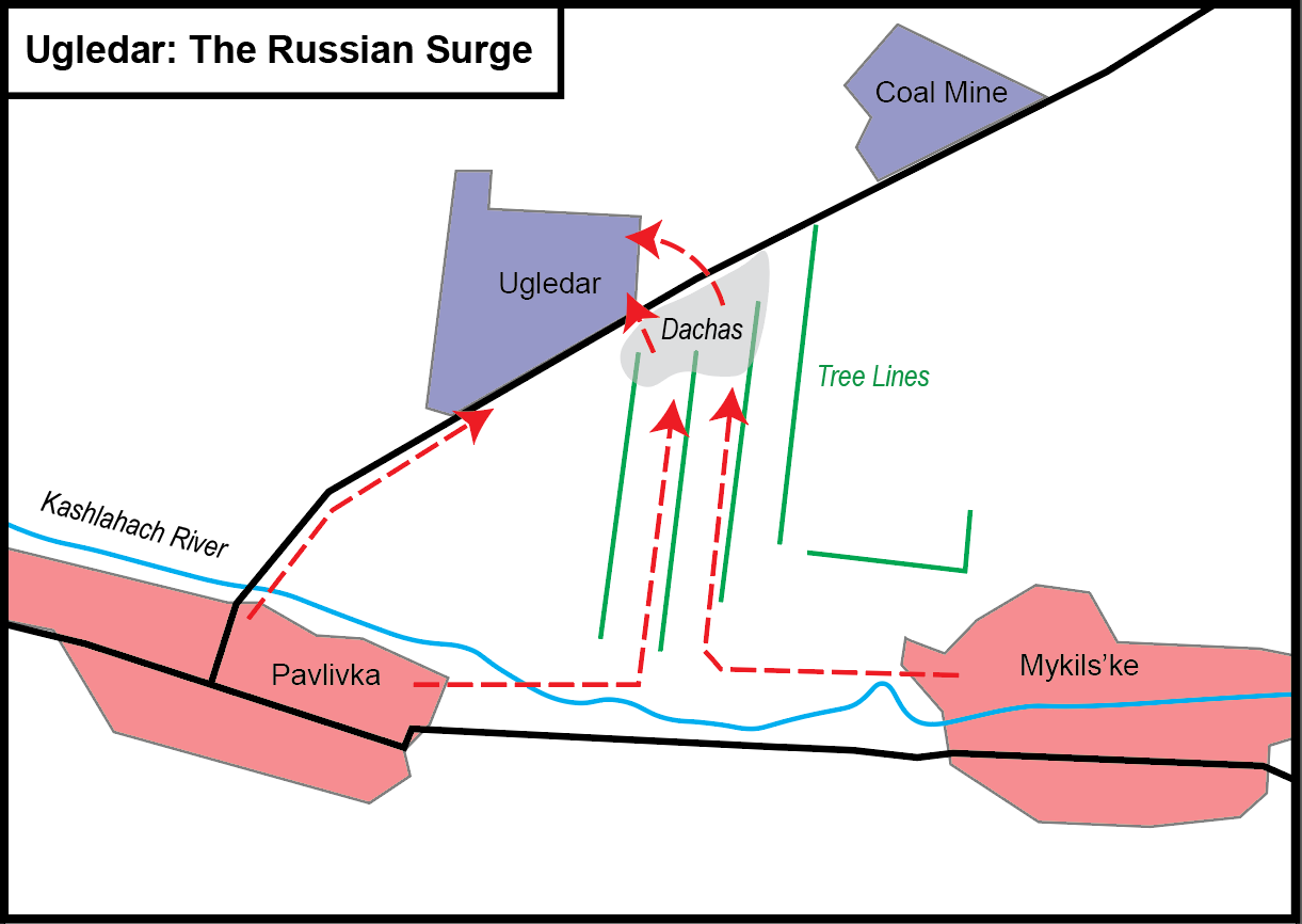 Finally, and perhaps most importantly, the Russian assault force neglected to attack or at least suppress the coal mine to the northeast of Ugledar. Ukrainian forces there were able to organize a quick counterattack, which came at an oblique angle towards the dachas. Once reserves arrived in Ugledar and counterattacked as well, Russian troops were forced to fight for their position in the dachas.