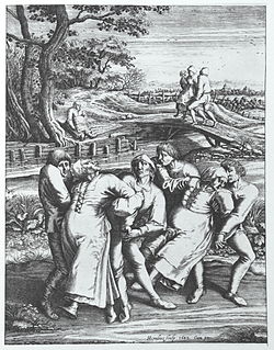 Dancing mania on a pilgrimage to the church at Sint-Jans-Molenbeek, a 1642 engraving by Hendrick Hondius after a 1564 drawing by Pieter Brueghel the Elder
