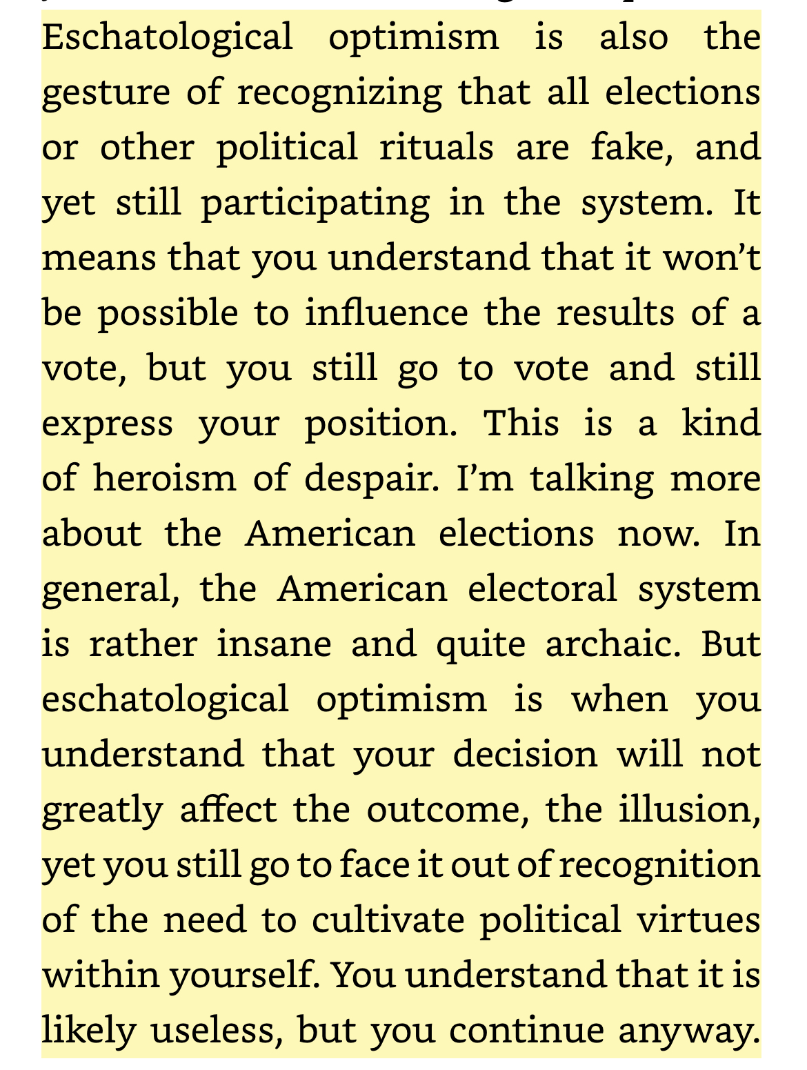At midnight, all swing states suddenly turn magenta. It's the first trans election in American history, the best of both worlds: high taxes and no war!I wonder what I will remember about tomorrow night?