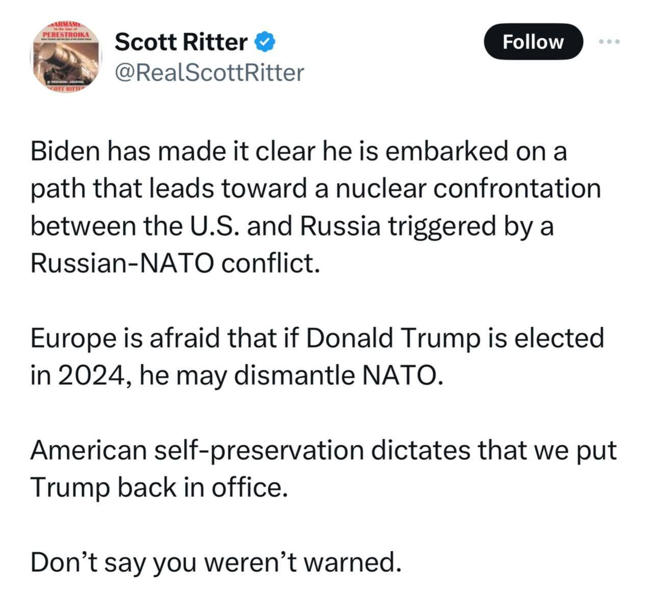 Scott Ritter: Biden has made it clear that he is on a path to a nuclear confrontation between the United States and Russia, provoked by the Russia-NATO conflict. Europe fears that if Donald Trump is elected in 2024, he could dismantle NATO. American self-preservation demands that we return Trump to power. Don't say you weren't warned.