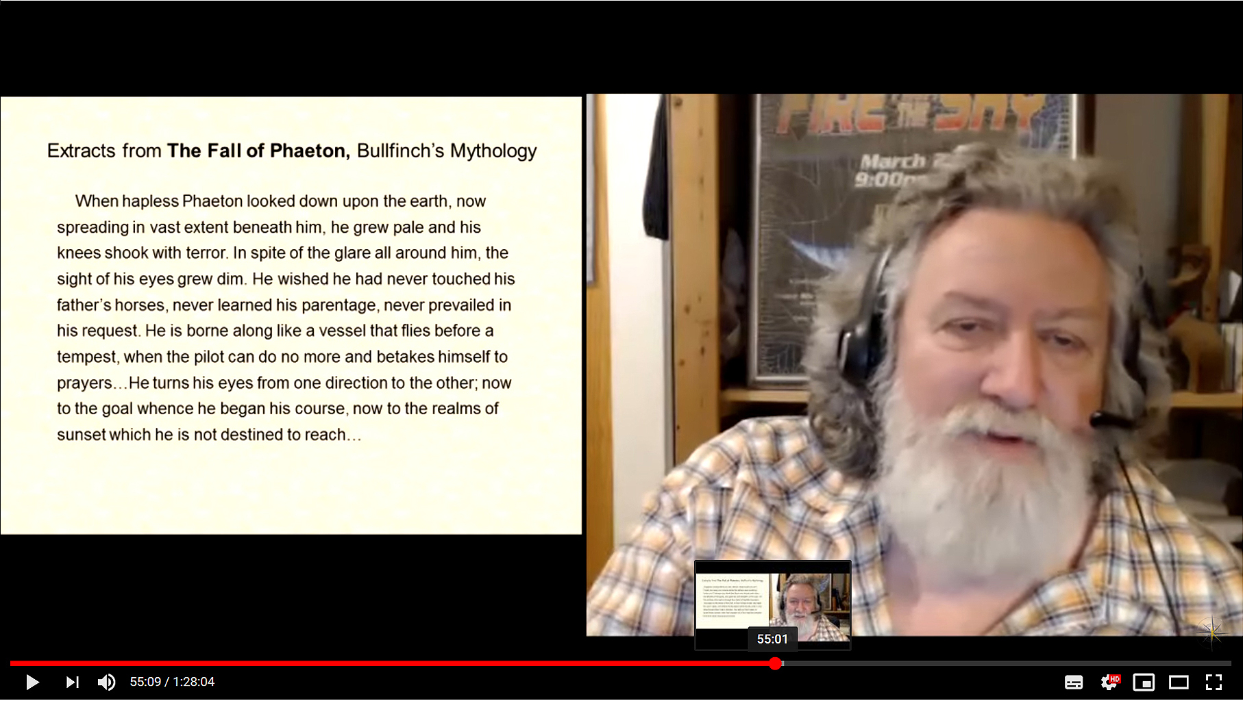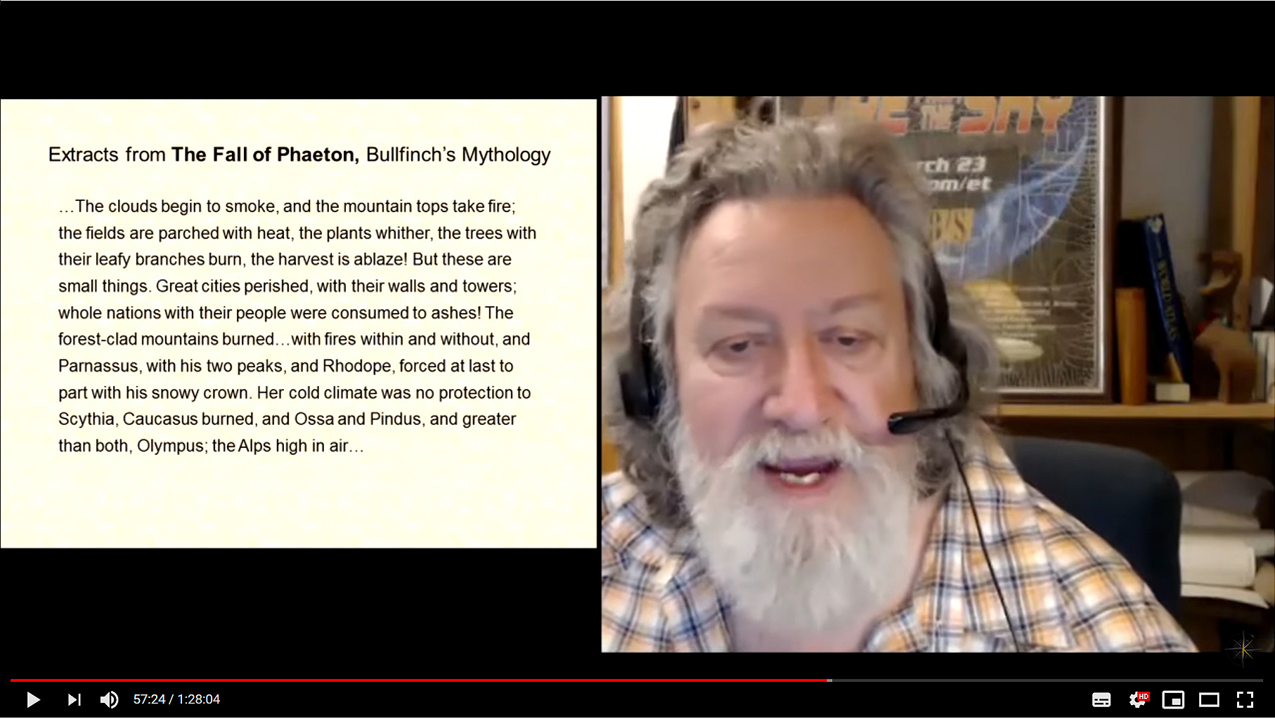 - Description of cataclysmic devestation like "and Parnassus, with its two peaks, and Rhodope, forced at last to part with his snowy crown" --> melting of glaciers