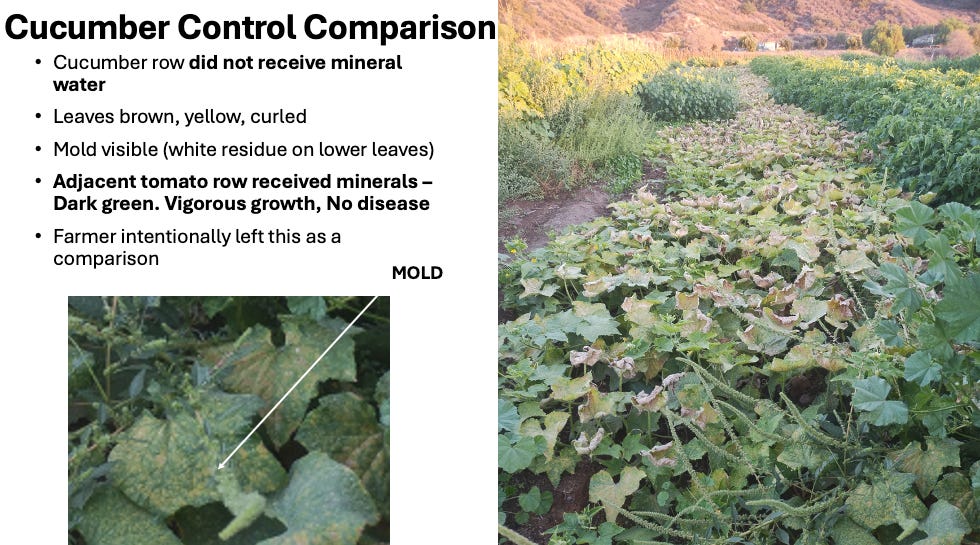A single control row of cucumbers was planted under identical conditions, except that both irrigation and foliar spraying used untreated water. That row tells its own story: dull color, curled leaves, fungal pressure, visible stress. It looks like what we’ve come to accept as normal.