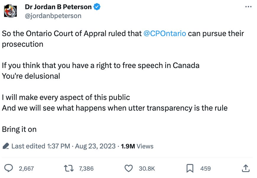 [Jordan Peterson and the College of Psychologists was used as an example.]