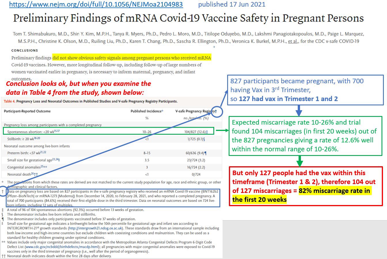 If analysis of the entire study rules out the above assumption ("127 had vax in Trimester 1 and Trimester 2" from the v-safe Pregnancy Registry), then, carry on, nothing to see here. But if the above assumption holds true, even after analysis of the entire study's results, then that is where you get your super high rate of miscarriages in the first 20 weeks.