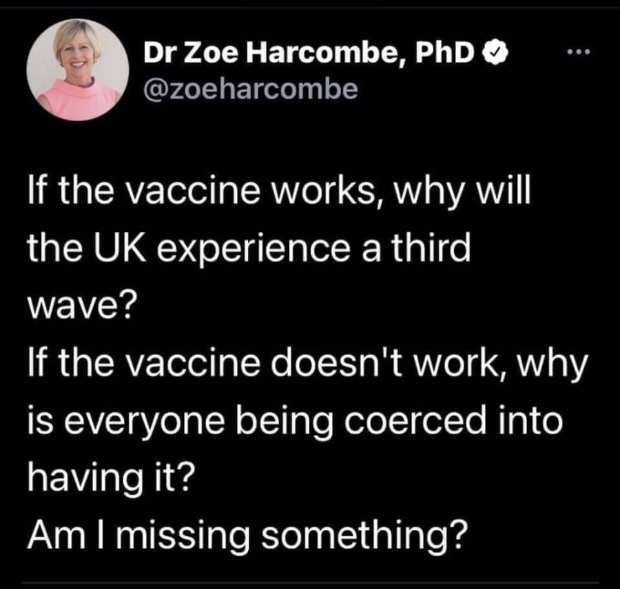She's missing that the vaccines are meant to make people sick, dead or controllable robots. The one thing no one is allowed to say for risk of being called a conspiracy theorist.