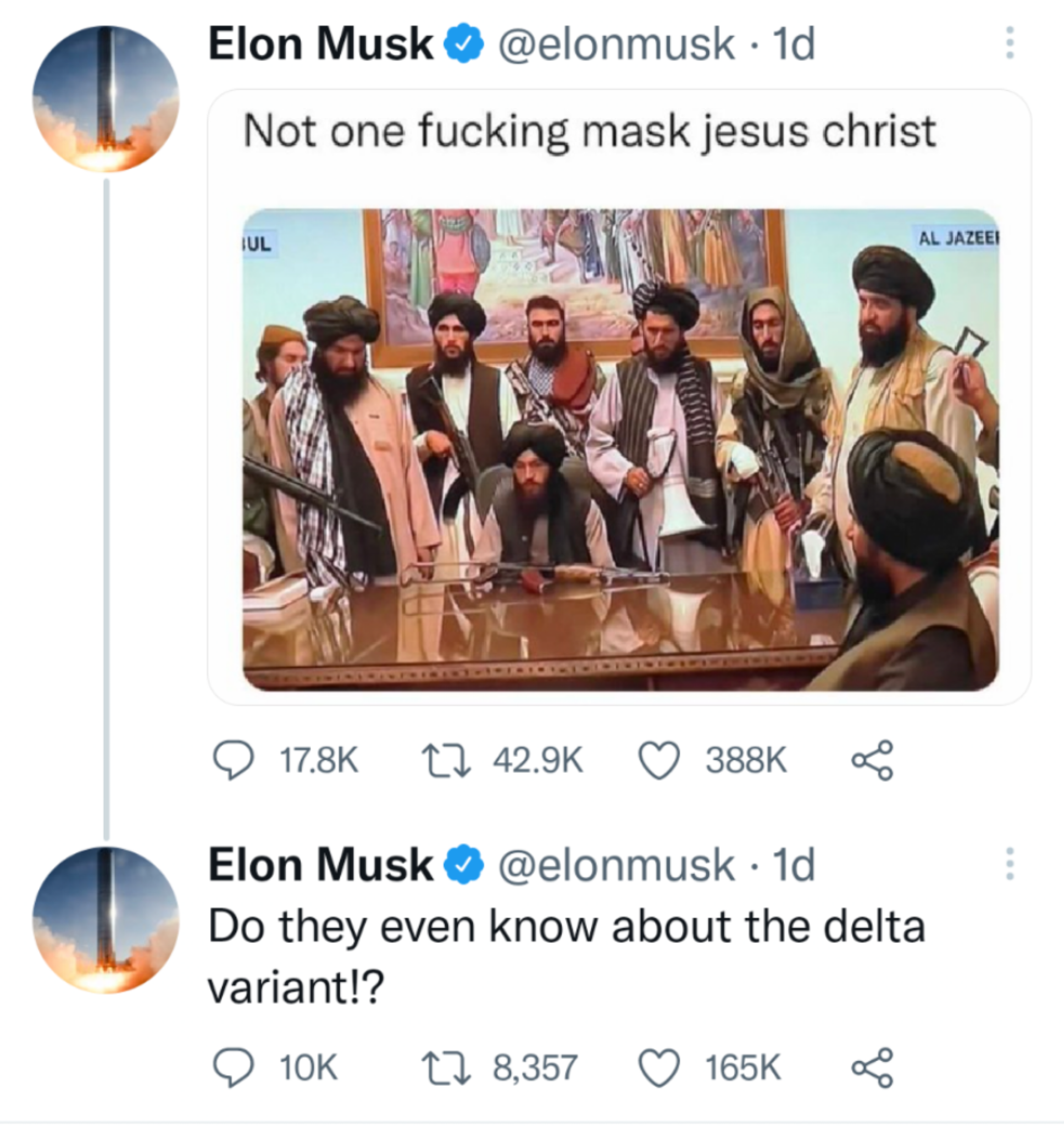 Yes, if the Taliban hadn't been so ignorant, they would all have been in ICUs or cowering in fear begging big Pharma for vaccines or been sick from wearing masks and inhaling their own toxins 24/7. They would never have been able to take over Afghanistan in such a state. But due to their complete ignorance of the pandemic, they are now in control.