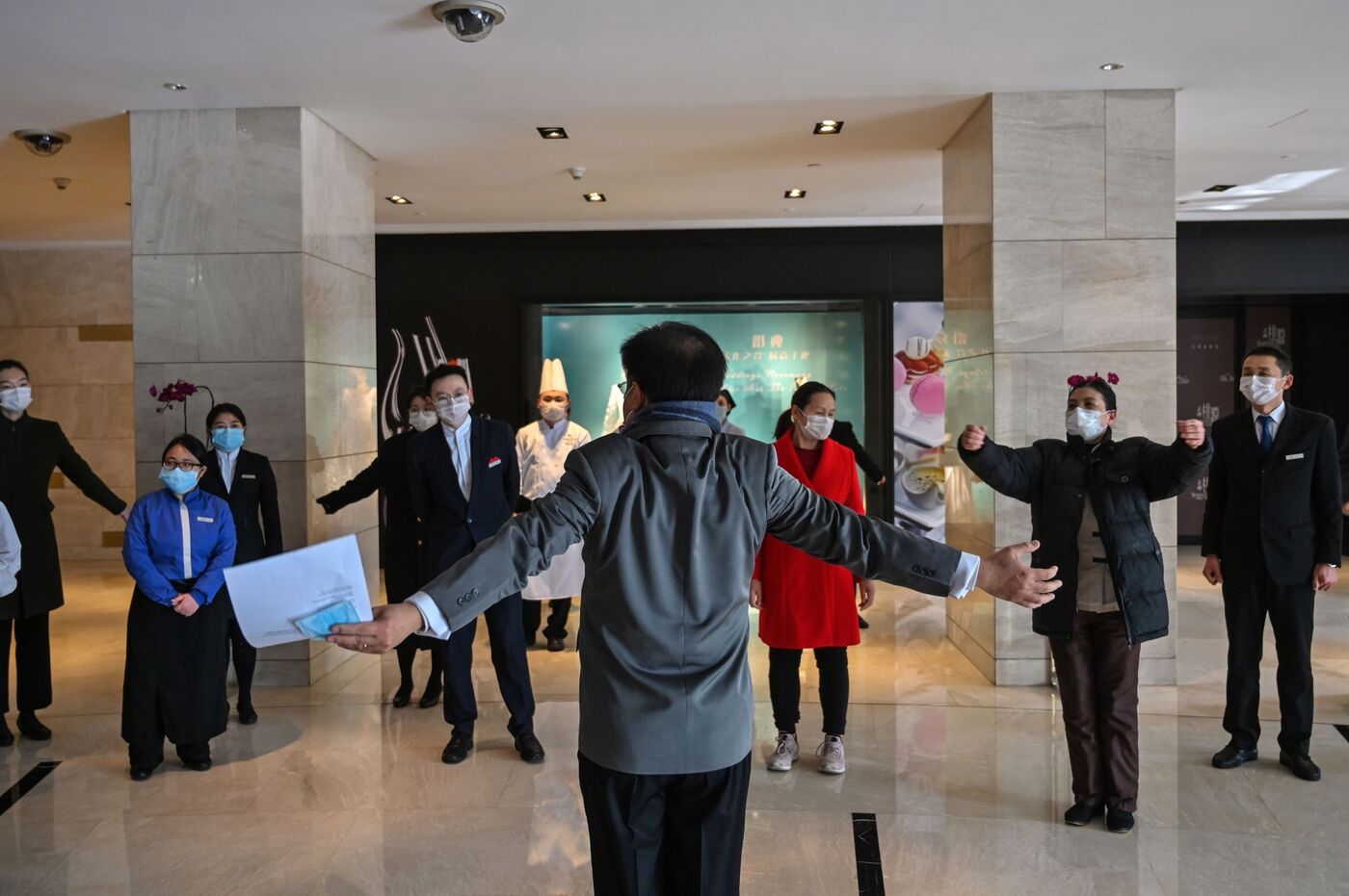 Hotel workers in protective masks exercise in the lobby during a staff briefing in Wuhan on Jan. 28.