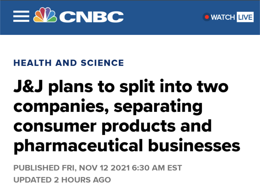 "Following a comprehensive review, the board and management team believe that the planned separation of the consumer health business is the best way to accelerate our efforts to serve patients, consumers, and healthcare professionals, create opportunities for our talented global team, drive profitable growth, and – most importantly – improve healthcare outcomes for people around the world," outgoing CEO Alex Gorsky said in a statement.