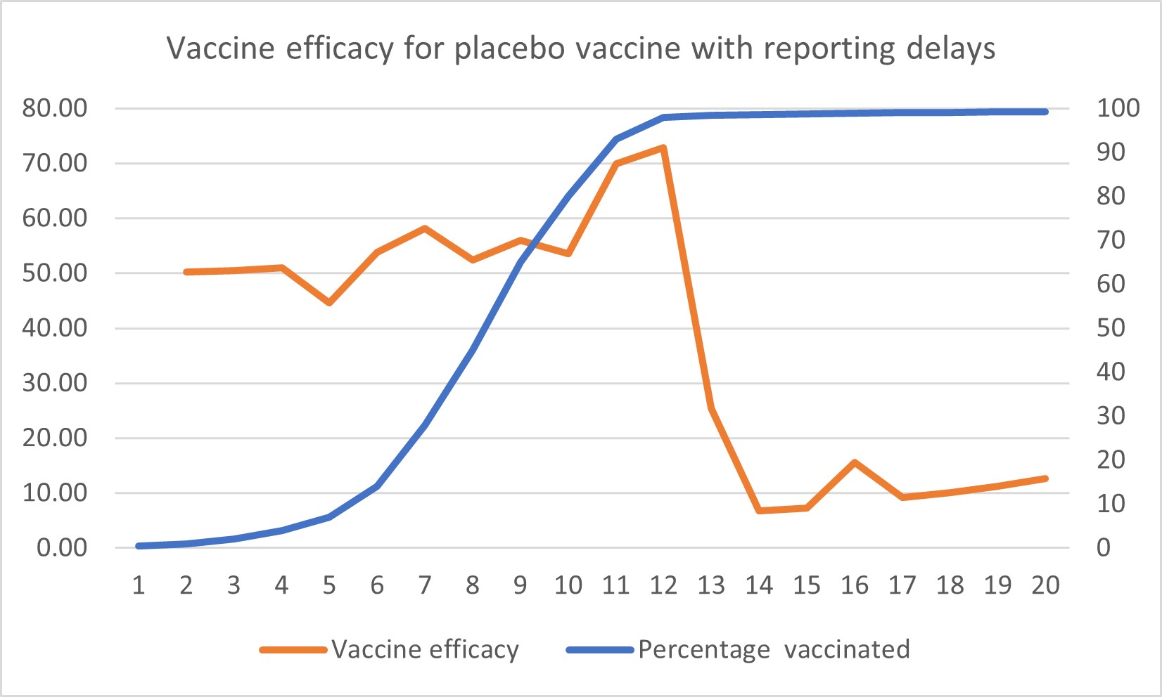 Finally, it is important to note that the same statistical illusion applies to all measures of vaccine efficacy whether they be cases, hospitalizations, or deaths. In fact, replacing the number of deaths in Table 1 with number of cases, with a one week reporting delay, would result in vaccine efficacy rates as shown in Figure 4.