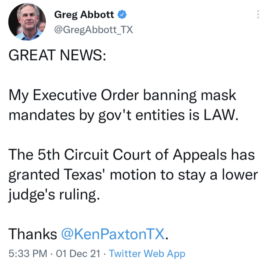 Texas should do what Florida did and actually have the legislature pass a law signed by the governor banning mask mandates and vaccine mandates, instead of this executive order nonsense.