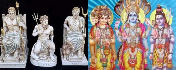 Both Hindu and Greek mythology is centered on three main Gods that are the designated leaders. Just like Hindu Mythology have Brahma (The Creator), Vishnu (The Protector and Preserver) and Shiva (The Destroyer of evil forces and the Transformer), Greek Mythology have Zeus (The Lord of the skies), Poseidon (The Lord of the Seas) and Hades (The Lord of the Underworld). Curiously, Indra, the Hindu king of the Gods, is but a caricature and is often depicted in stories as vengeful and petulant. Zeus, in contrast, is all-powerful and feared by all his subjects.