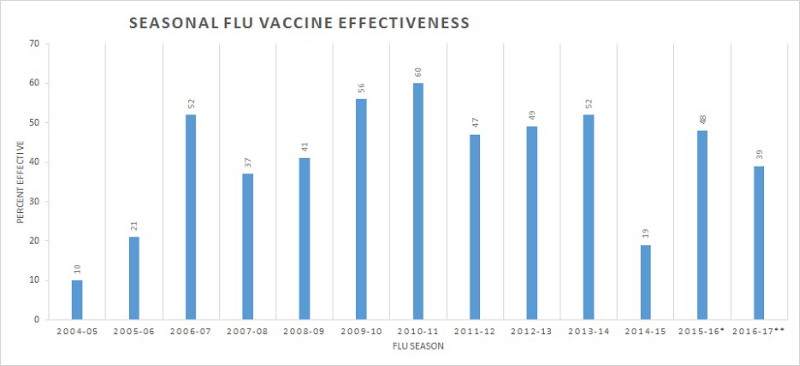 Influenza vaccine effectiveness, 2004-2017 (Source: CDC)