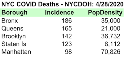 Manhattan is highest density and lowest incidence. The Bronx is half the density of Manhattan and nearly twice the incidence