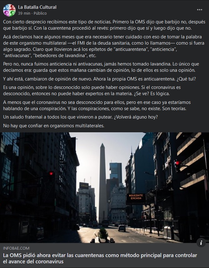 Here we were saying a few months ago that it was necessary to be careful about taking the word of this multilateral body - the IMF of the health debt, as we call it - as if it were something sacred. Of course, it rained here the epithets of "anti-quarantine", "anti-vaccine", "bleach drinkers", etc.