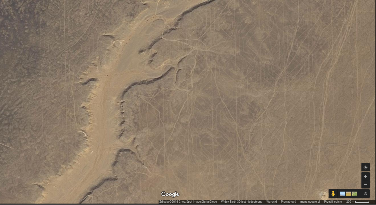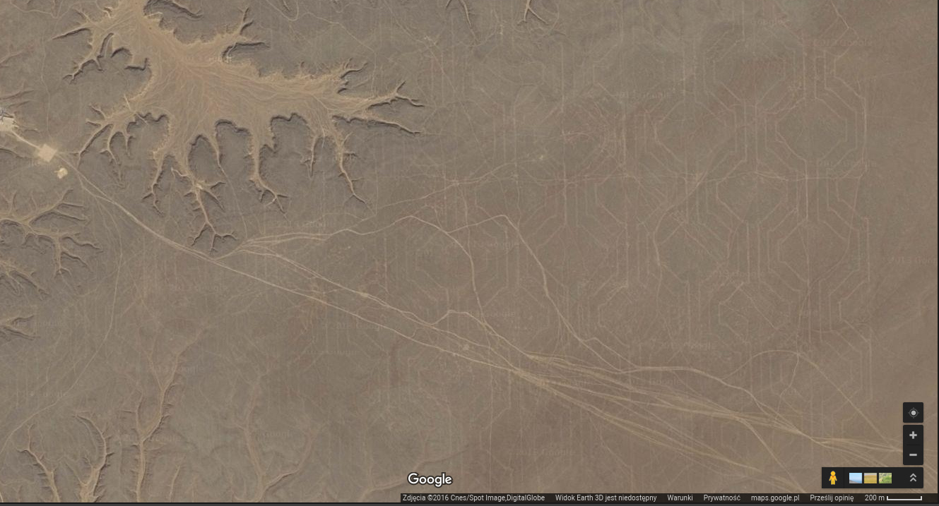 Note the size of the pattern: each cell is ~400m high/wide. Also, the design seems pretty intricate, decorative even, with lines being subtly curved. It reminds me of Arabic style. Given the size, it looks quite impressive and may point to an advanced civilization having once lived in that region.