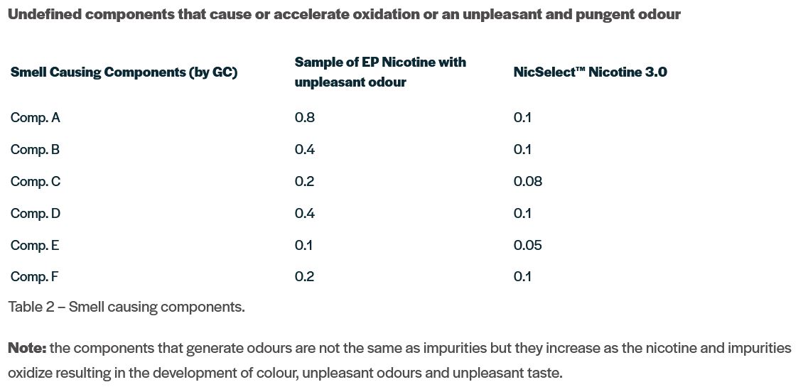 In addition, the Alchem NicSelect R&D team carried out experimental tests to compare NicSelect Nicotine 3.0 and Standard EP Nicotine (see Table 1) and identified a series of components (see Table 2) which, when present in amounts greater than 0.3% individually or added together in amounts greater than 0.4%, cause or accelerate oxidation or an unpleasant and pungent odour.