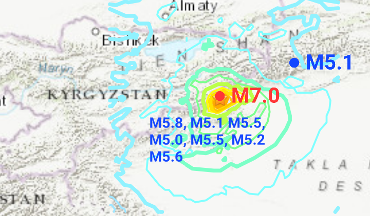 Finally, both earthquakes occurred in a mountainous area that is difficult to access. Weak shaking could have been felt in Aykol, located 139 km from the epicenter, and in Karakol 143 km away.