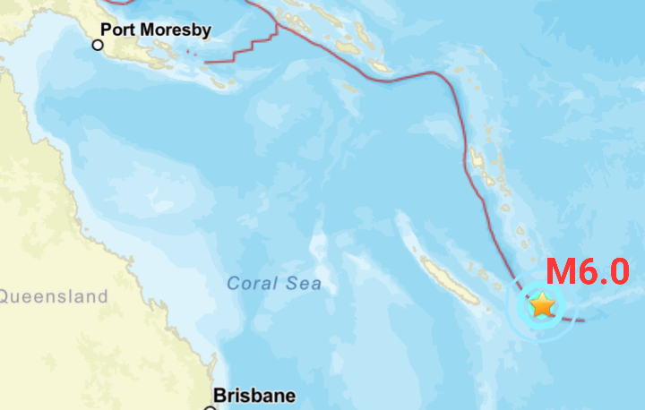 A very strong magnitude 6.0 earthquake occurred in the South Pacific Ocean 110 km (68 mi) from New Caledonia