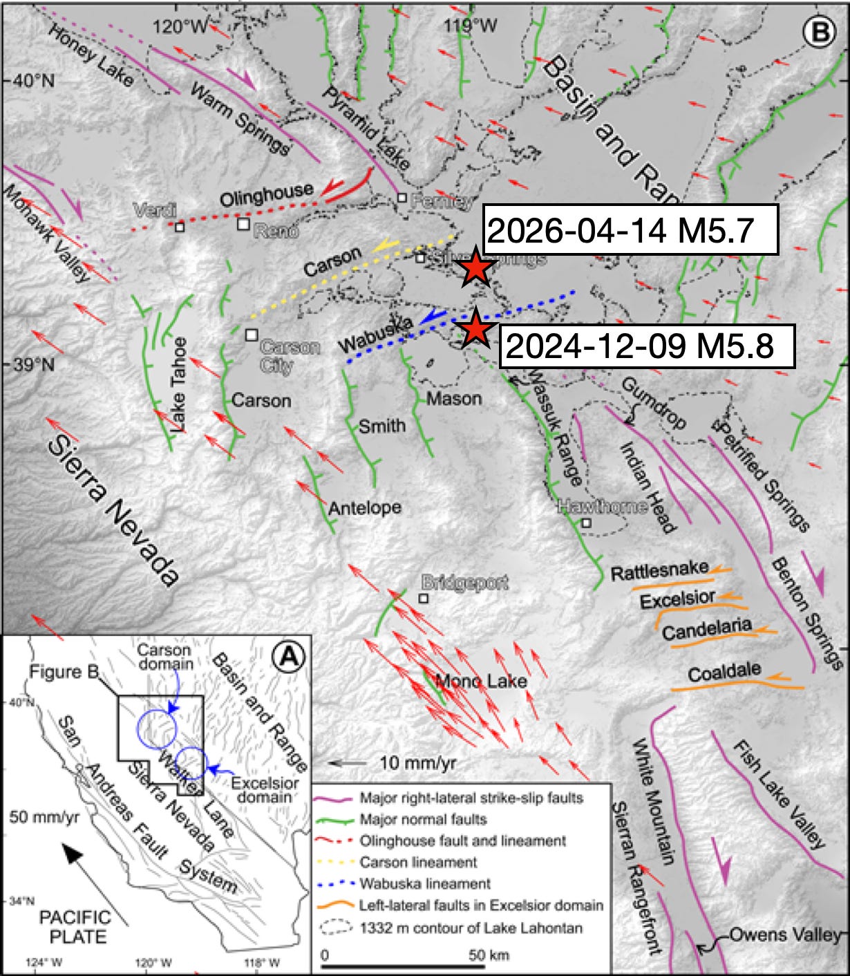 Figure 6: Map of major faults in the central Walker Lane. Figure 1 of Li et al. (2017); red stars added to show the locations of the recent earthquakes.