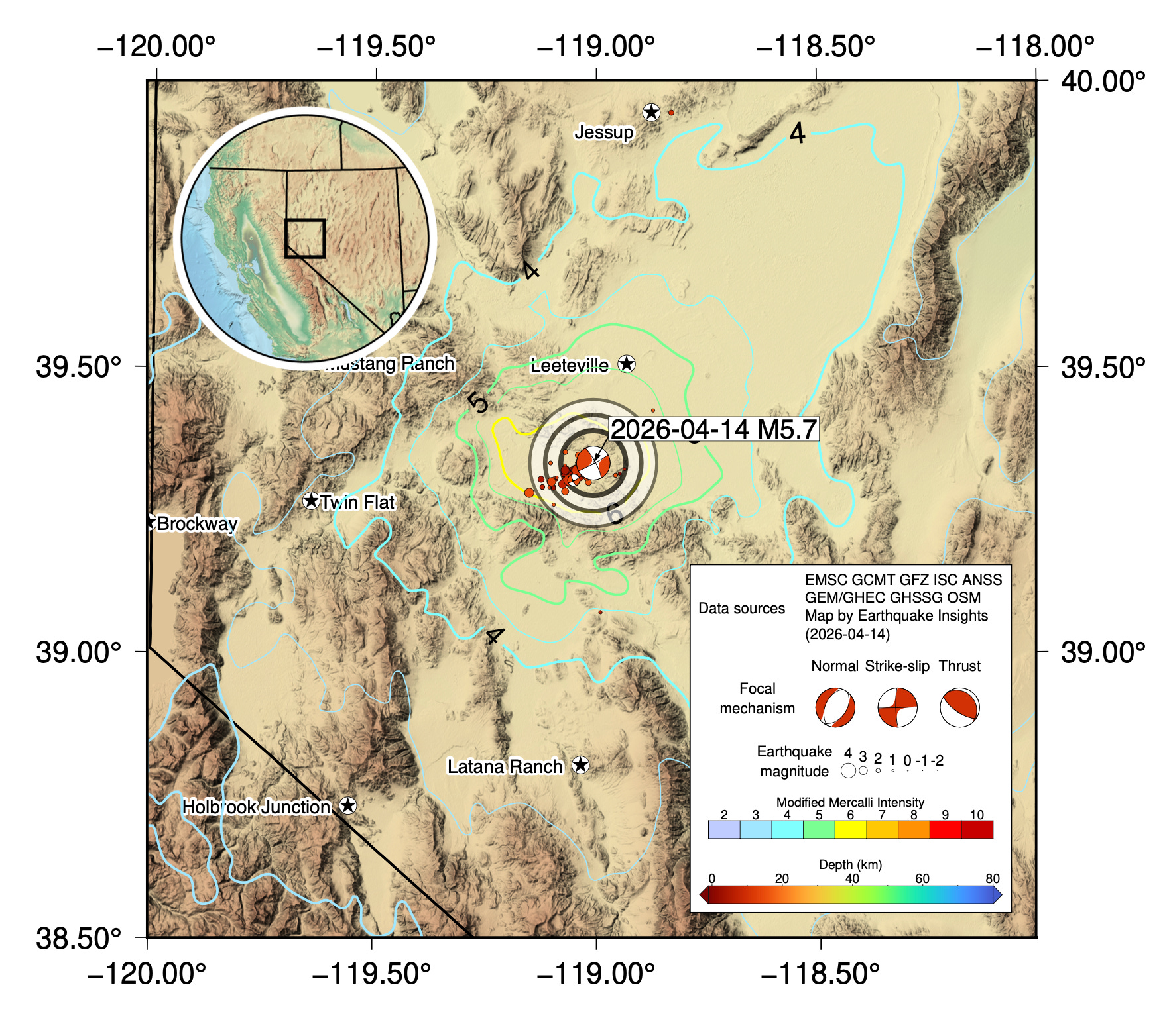 Figure 1: Map of the 2026-04-14 M5.7 earthquake and its aftershocks. Colored lines are contours of estimated shaking intensity from the USGS.