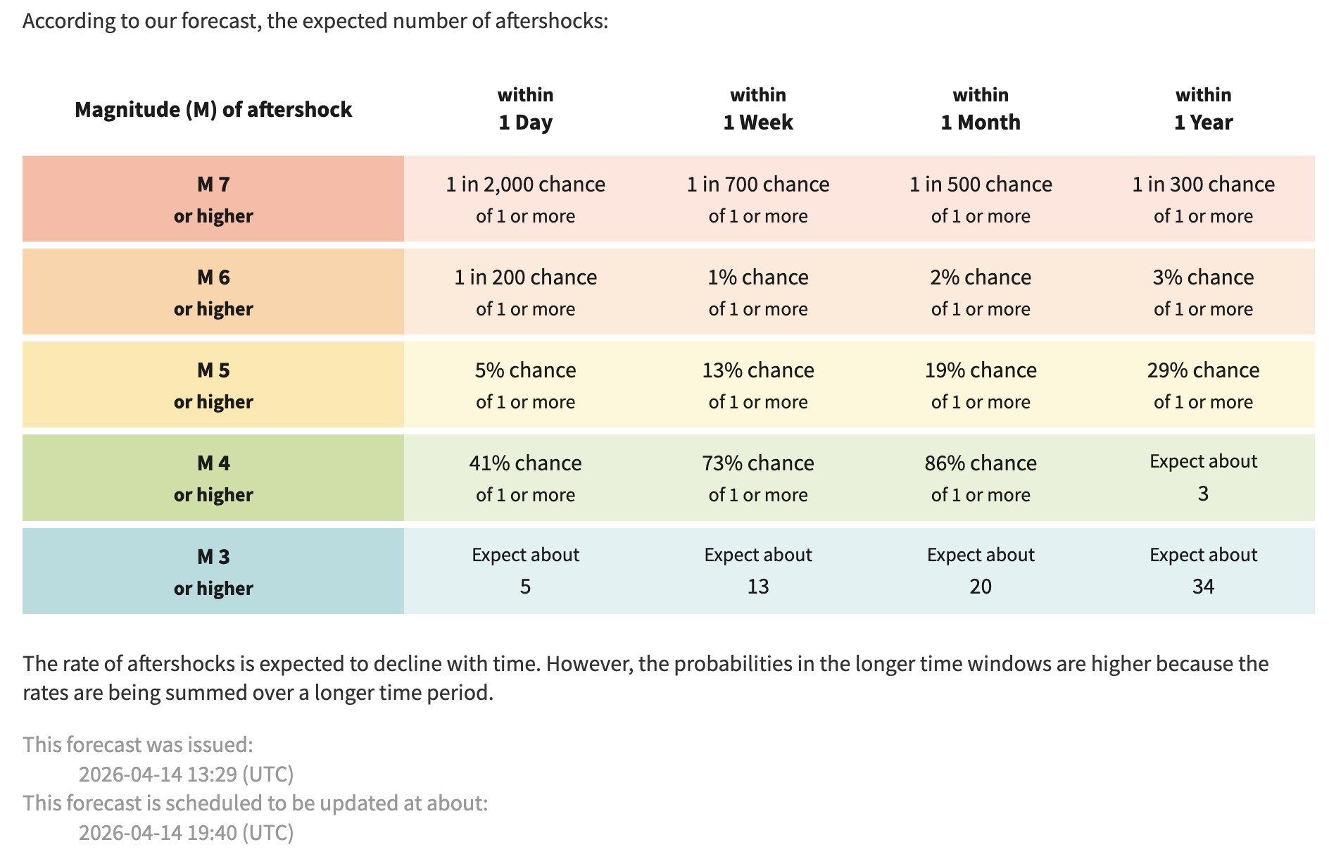 Figure 11: USGS Aftershock Forecast for the 2026-04-14 M5.7 earthquake. Source: