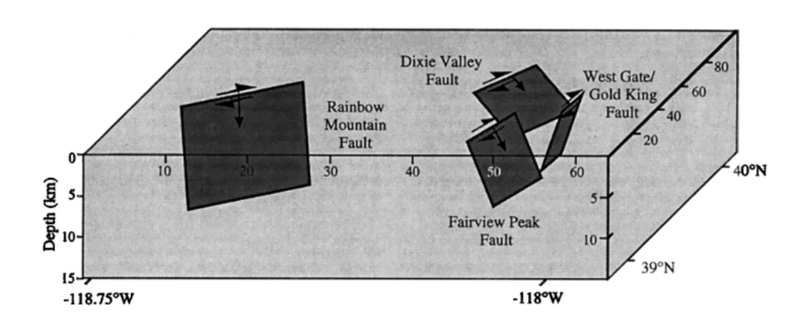 Figure 9: Fault models used to evaluate the Rainbow Mountain-Fairview Peak-Dixie Valley earthquake sequence. Figure 4 of Hodgkinson et al. (1996).
