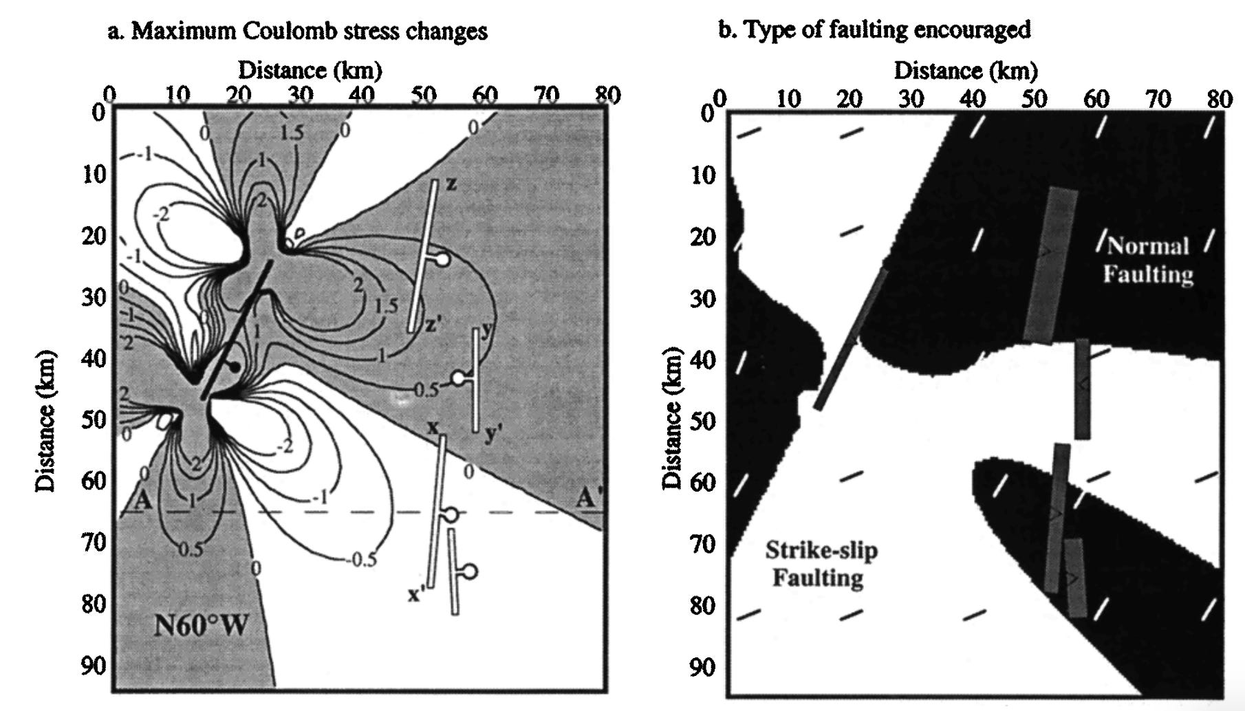 Figure 10: Results from calculating stress changes caused by the Rainbow Mountain earthquake. Source: Figure 6 of Hodgkinson et al. (1996).