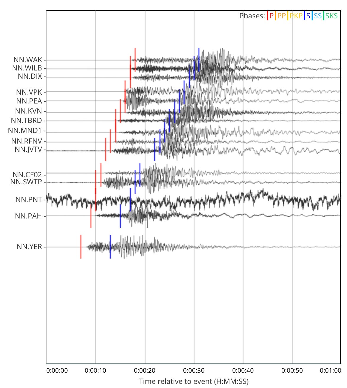 Here are some recordings of the shaking for the one minute after the earthquake started, within 1° (~110 kilometers) of the epicenter. The stations closest to the epicenter are at the bottom, and those further away are at the top. The red and blue lines mark the approximate arrival times of the P and S waves, respectively. In general, it looks like the stronger shaking lasted ~10-20 seconds, although it isn’t possible from this plot to know what level of shaking was detectable.