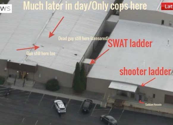 Moreover, if they were right there, they literally can poke their head out the window and get a really close shot and have eyes on the shooter. Hell it is a metal roof (someone walking on it presumably would make noise) and that window WAS open, they probably could have heard him and peaked their head out the door. Why did they even need to send somone up on a ladder, they literally could have spotted him from that window and made a easy layup shot to shoot him. Not the 400 yard shot through a 9 inch window in a tree shot that Dan Bongino said finally took him down (it was not the snipers anyone has seen in the video; I am still unclear what direction other than triangulating from that tree on the right of the building if that is the tree he was talking about).