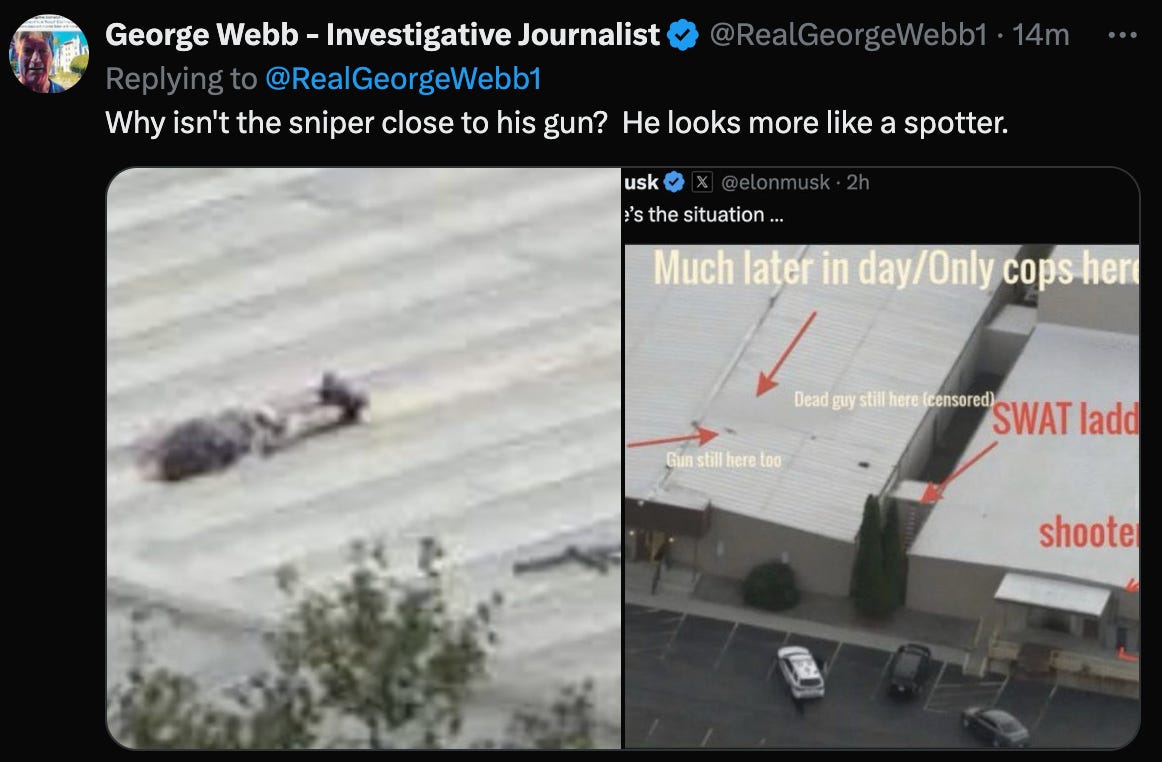 Even published pictures make it look like Crooks was spotting for a sniper, not the actual shooter. His dead body lies a significant distance away from the gun he hauled up to the roof. Was he bringing a gun to a SWAT member? Why was he killed so far away from the weapon?