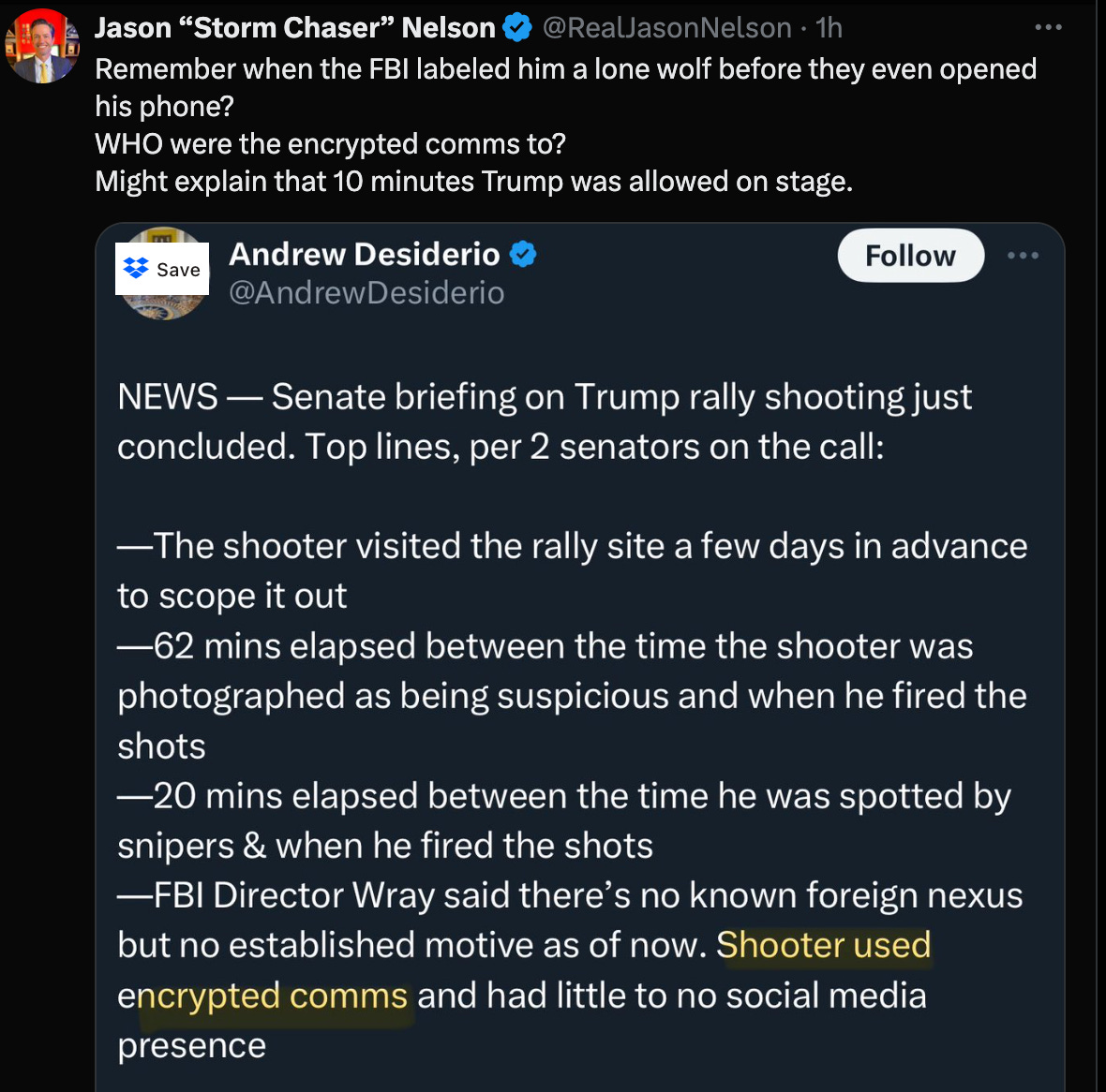 But there will also likely be disinfo included with the real info. Maybe the disinfo is the idea that the SS knew beforehand of a threat, but allowed Trump to take the stage anyways. That makes Cheatle and the SS look even worse, securing in the minds of the Senators that she is to blame. It's incompetence to a whole different level! It also indicates the potential for the SS being in on the job. It's an emotional time, and the intel faction knows that angry Senators and the American public needs a scapegoat.