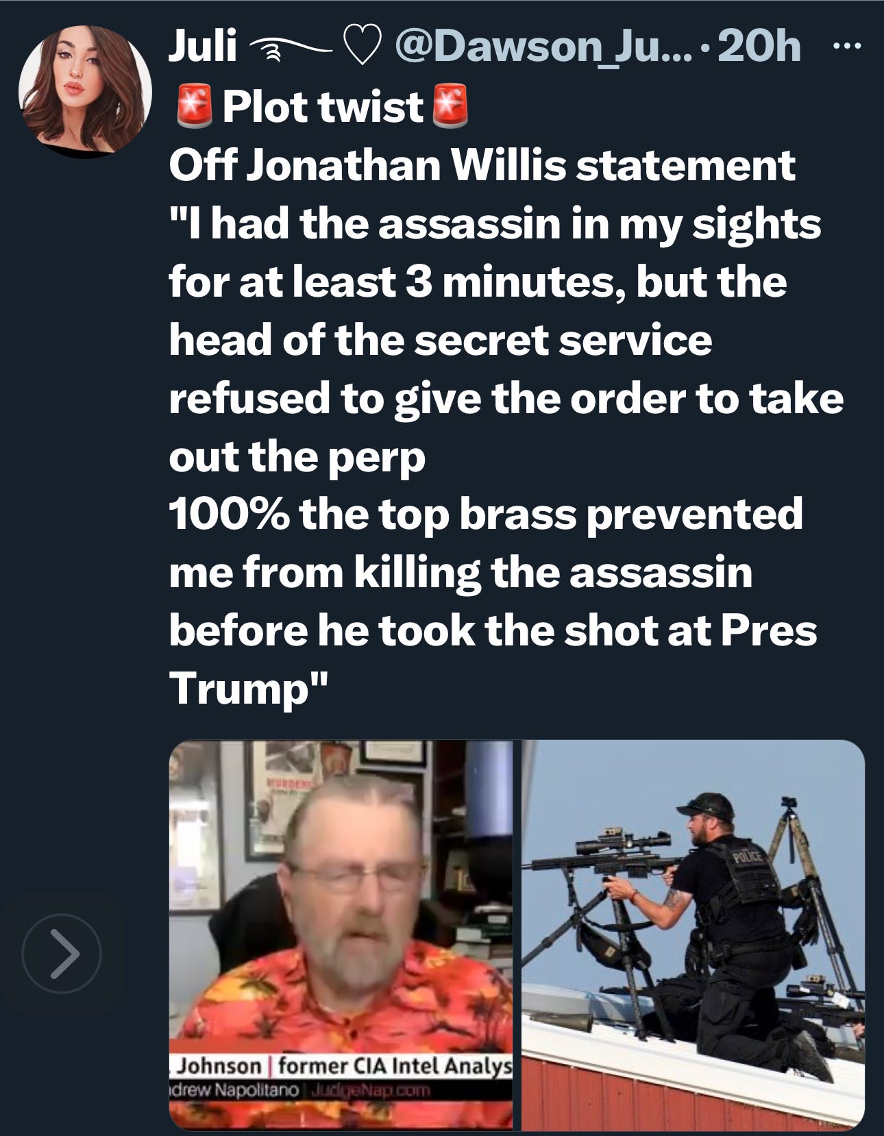 In another troubling story about the Secret Service’s judgment, Jonathan Willis, reputedly a Secret Service sniper, had the Crooks roof shooter in his sights for three minutes and was not permitted to fire. Video evidence appears to bear this out.