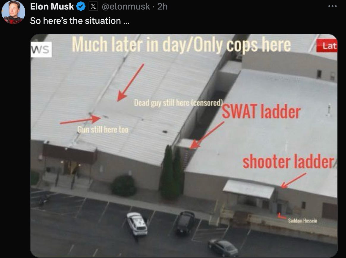 “Inside the perimeter” and “outside the perimeter” were the key phrases slung around Butler Township Police Department this morning. I had a feeling there were active discussions on assigning blame where these were the operative phrases. Clearly a ladder was used by the Crooks shooter to ascend to the roof. Elon Musk has tweeted out the location, which is very close to a SWAT ladder in the same building.