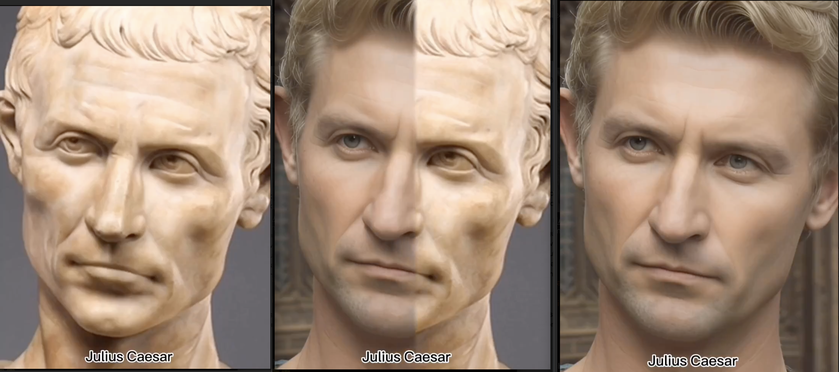 This is an image that is part of the iconography of Julius Caesar, is an image generated by AI as part of the study of reassembly of Roman emperors. We must be clear that it is certainly one of the possibilities of reality but it offers another interesting perspective to observe, from my point of view it creates a effect of closeness and sympathy towards something more objective