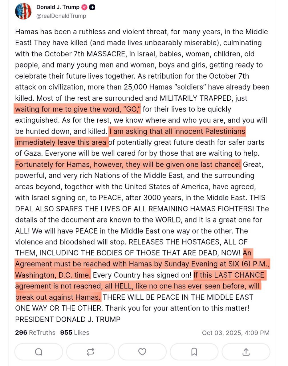 Trump gave Hamas until 6 PM Sunday (Washington time) to release all hostages — under his “peace plan” (drafted with Israeli input) that places Gaza under a technocratic administration backed by the IDF — or, as he warned, “all hell will break out.”