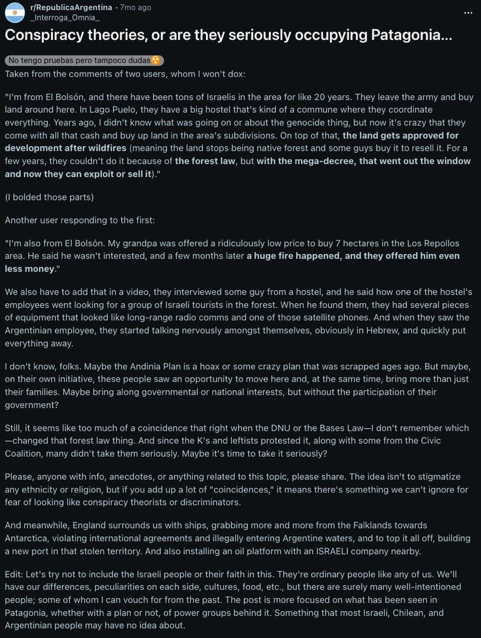 “Plan Andinia.” People were dropping links to old documents, Herzl quotes, 1970s Argentine military reports, and modern threads tying it all to Milei’s policies, foreign “backpackers,” and the fires. I put two and two together, and down the rabbit hole we go…