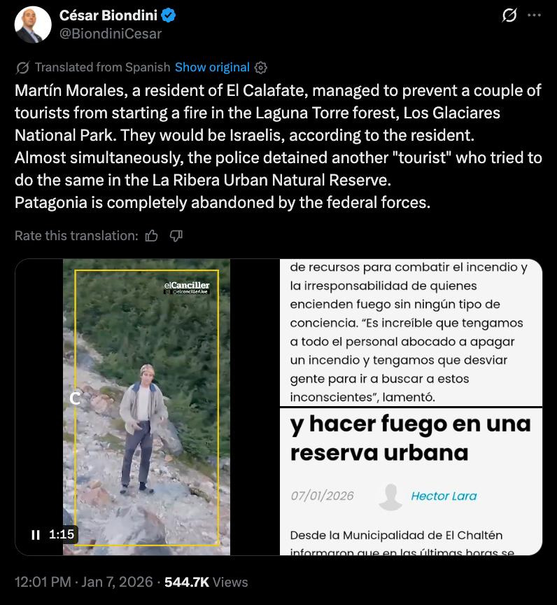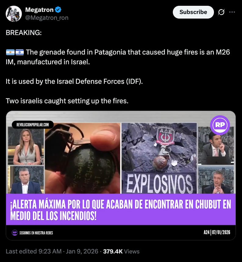 Epuyén, and prompting evacuations amid thick smoke, destroyed homes, and threatened ecosystems. Thousands of Argentines and other Spanish speakers were flooding the replies on X posts about the blazes, most of them incredibly irate at the Milei government. Phrases like “The Zionists are trying to steal Patagonia!” and “Milei has sold us out to Israel!” popped up repeatedly in viral threads, with users sharing videos of suspicious activity and linking the fires to foreign interests.