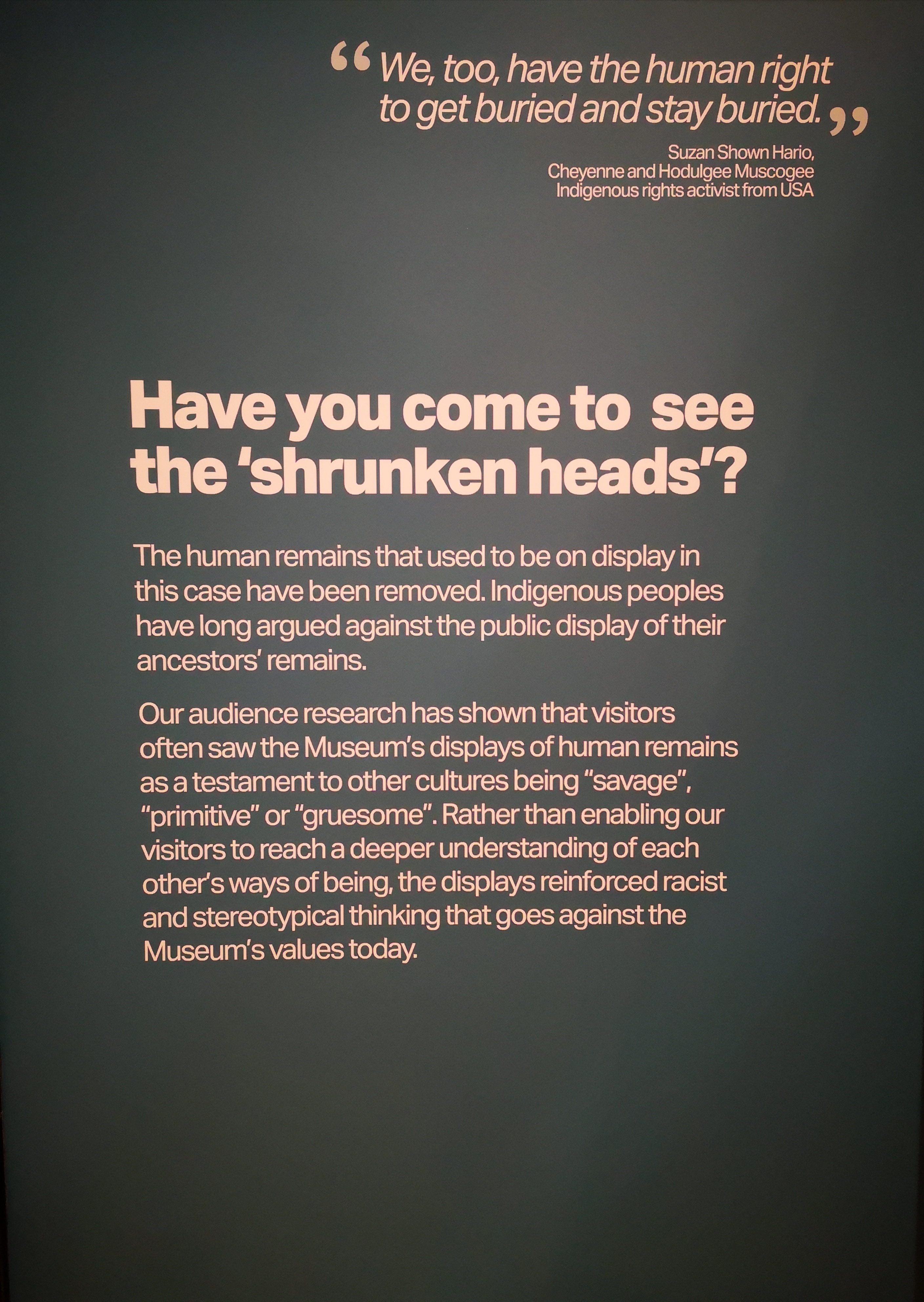 Total nonsense. First, the quote at the top is collectivist nonsense. Who is "we"? Certainly not the person saying the quote - she's still alive - or any of her family members. "My" ancestors are all over North America and Western Europe. I'm sure some of their more interesting remains and burial practices are on display in numerous museums. Arguing that the truth "reinforces racist and stereotypical thinking" is no excuse for covering it up. Again, speaking of my ancestors, there was no shortage of savage, brutal, gruesome behavior.