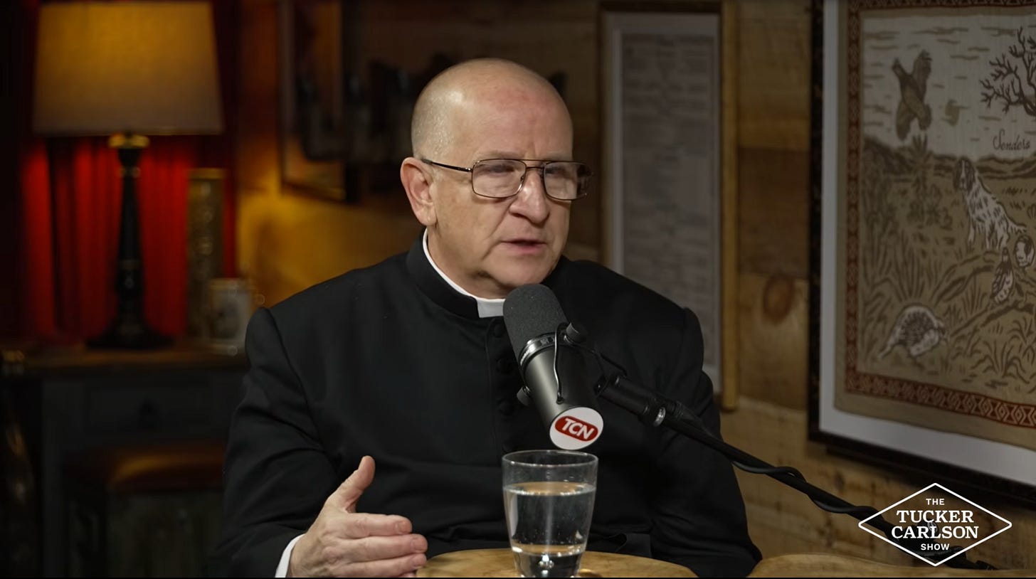Father Chad Ripperger on Tucker Carlson's podcast, April 2026. Ripperger describes the clinical mechanics of demonic possession.