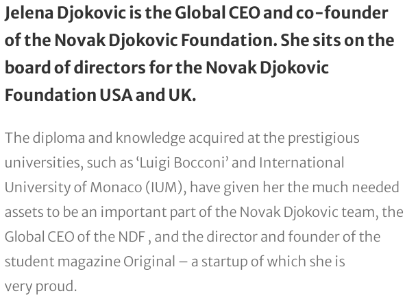 So from the above we can see that Mrs. Djokovic is no small town girl suddenly making it big. Early on she had the resources to move into the upper levels of Social status. In 2011 she's a well educated , worldly and at that point probable well connected individual. No commoner for sure.