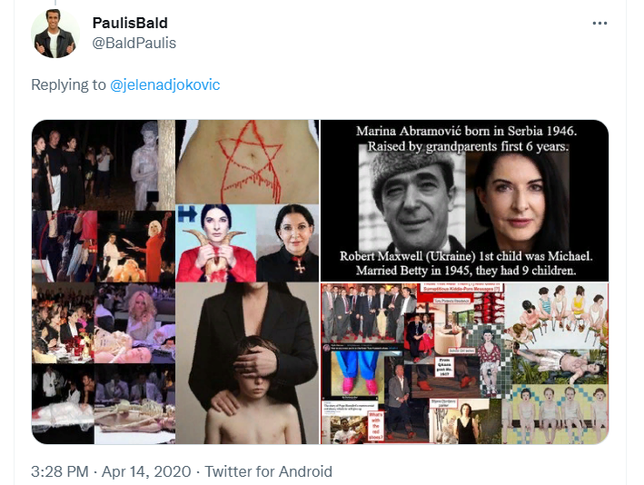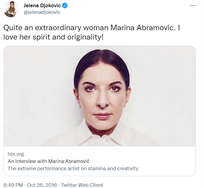 I used the word "defending", because in 2016 Abramovic was getting very bad PR due to Spirit Cooking being mentioned in the Podesta/Clinton leaked emails. The timing of the tweet gives a strong impression that in that storm of controversy Jelena Djokovic was coming with some support to a fellow Serb. I don't think this is an outrageous assumption.