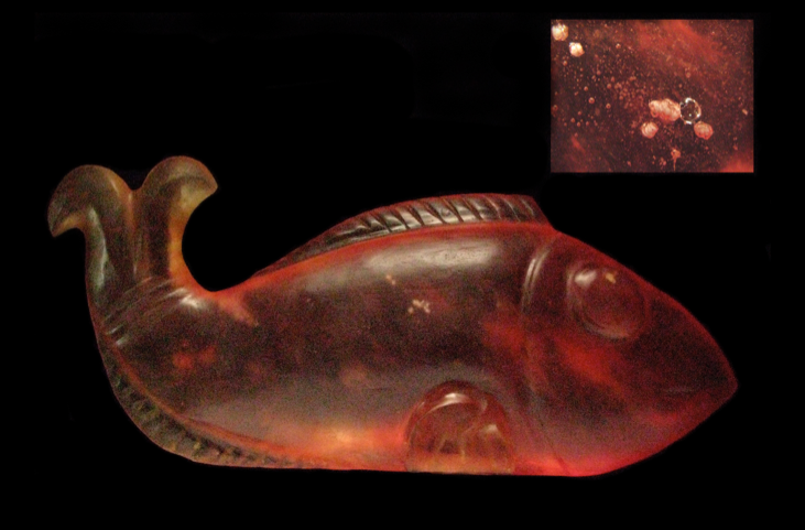 Figure 11. Two Carvings with encased crystals, presumptive micro-diamonds. The biggest in the mask measures 0.5 mm, and the one in the fish, 3 mm, The mask shows in a cleft (inset images) many much smaller crystals, surrounded by what appears to be black carbon. Images: David Anderson.
