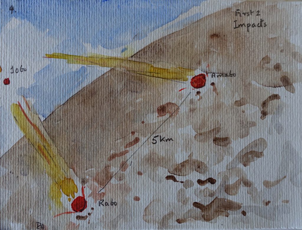 Figure 16 (© DCA) Images run from left to right and top to bottom. Postulated sequence following impact of a dumbell-shaped bolide (600 metres long) in Inner Mongolia.