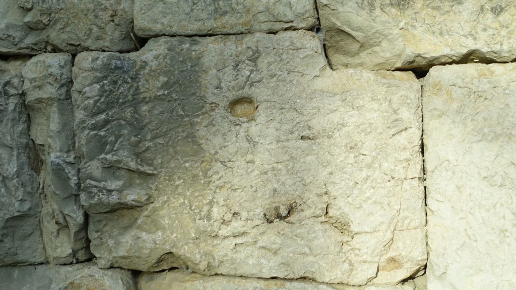 Figure 23. Part of the megalithic walls of the town of Amelia, Umbria. This 10 ton stone is one of many there that include a drilled recess that (paired with a complemntary one opposite) might have been used in the balloon-lifting process. Once developed the process could easily be scaled up to lift ever more massive structures.