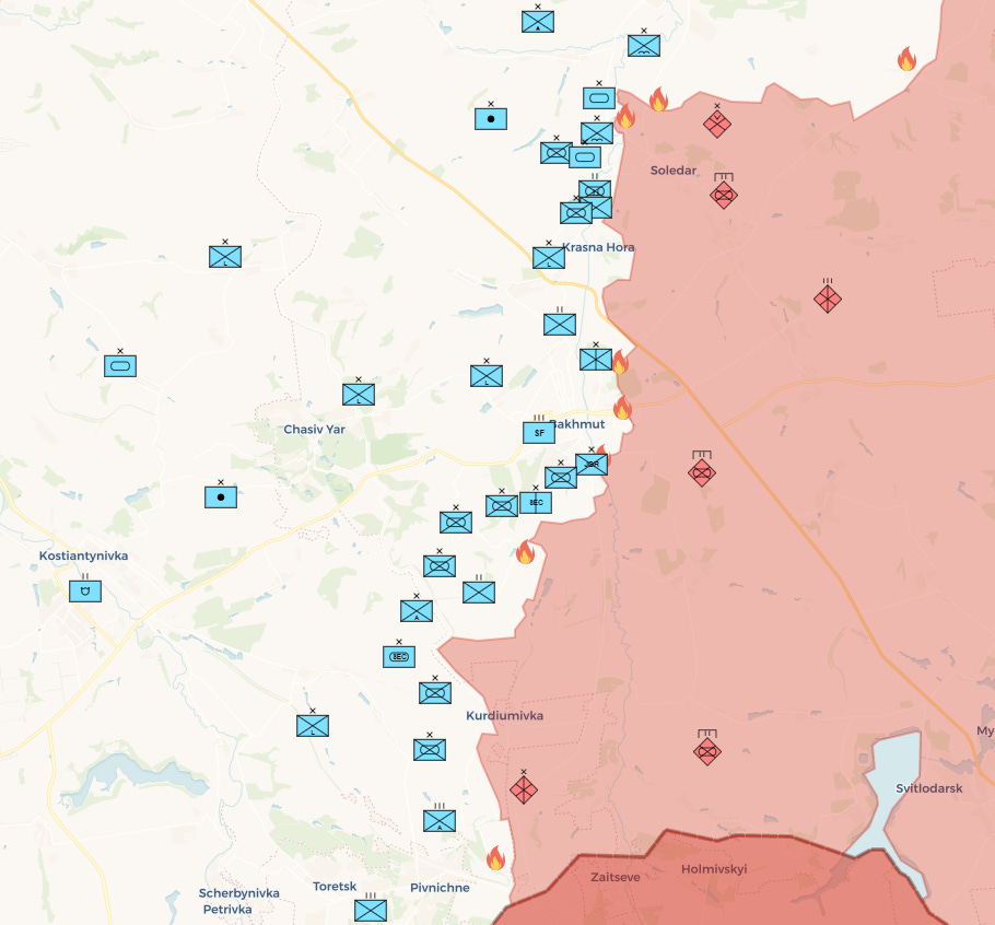 These positions are absolutely critical for Ukraine to hold. The loss of Bakhmut will mean the collapse of the last defensive line standing in the way of Slavyansk and Kramatorsk, which means Ukraine’s eastern position will rapidly contract to its fourth (and weakest) defensive belt.