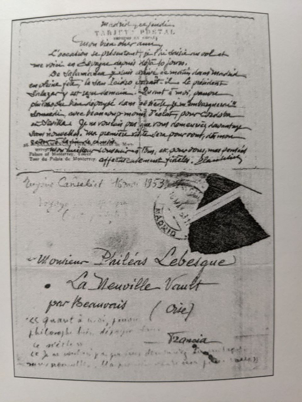 According to letters recovered, Canseliet flew to Spain in 1952 or 1953. This is a facsimile of a letter addressed to his friend Philèas Lebesgue where it can be read painstalkingly 16 Mai 1953: