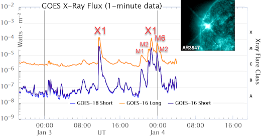 X 1.8 Solar Flare today. 3 X-flares so far from 3947. Ethiopia Quakes update. Saturday 1/4/2024