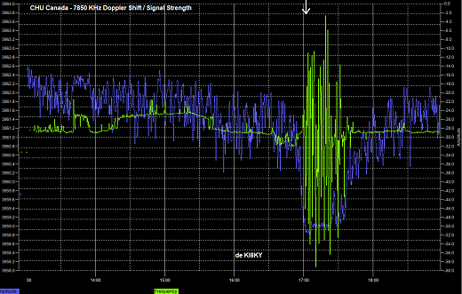 When radiation from a solar flare hits Earth's atmosphere, it ionizes the air, temporarily boosting the thickness of our planet's ionosphere. Any radio station skipping off the ionosphere will suddenly find its frequency Doppler shifted. Frequency standards stations such as WWV, WWVH, and CHU transmit carriers with atomic-clock grade frequency stability, so they are perfect sources for Doppler monitoring.