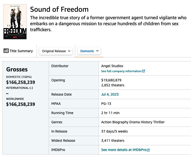This, of course, is just my opinion, but I think that this film is a very good thing. It gets out into the open the hideous, despicable child sex trade and the sexual abuse of children into the open for everyone to see. I think it, also, shows just how desperate the left woke crowd are to do anything and everything to degrade the movie and those behind it. To do whatever they can to keep people from seeing it.